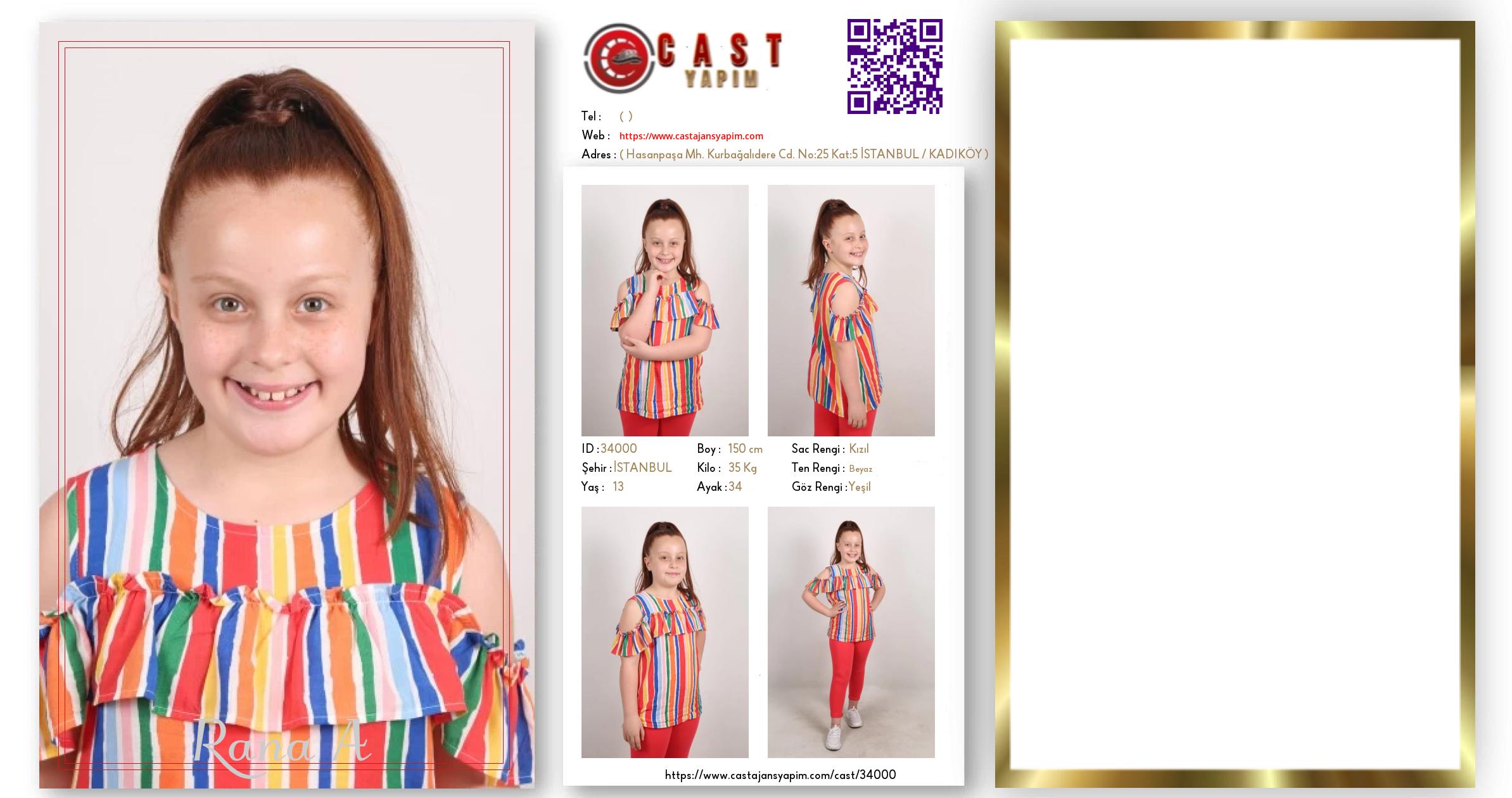 Merhaba, ben Rana. İSTANBUL şehrinde yaşıyorum ve 13 yaşındayım. Genel özelliklerim arasında boyum 150 cm, kilom 35 kg, saç rengim Kızıl, göz rengim Yeşil, ten rengim Beyaz.