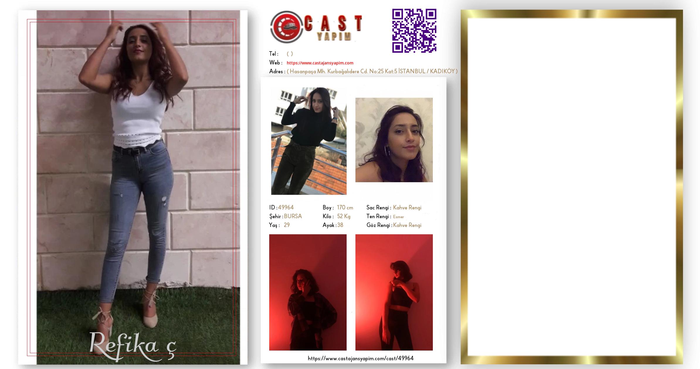 Merhaba, ben Refika ç. BURSA şehrinde yaşıyorum ve 29 yaşındayım. Genel özelliklerim arasında boyum 170 cm, kilom 52 kg, saç rengim Kahve Rengi, göz rengim Kahve Rengi, ten rengim Esmer.