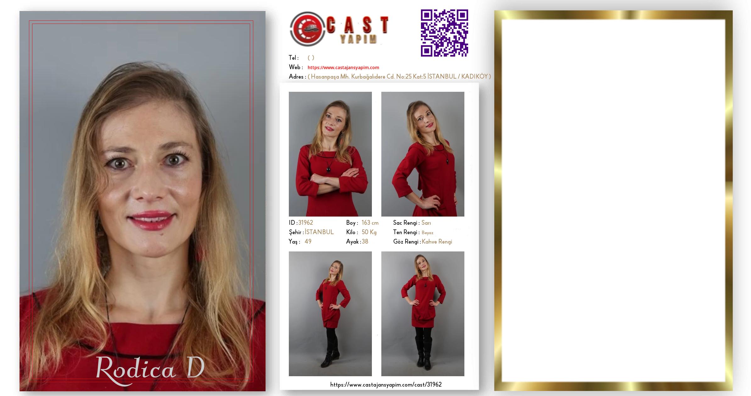 Merhaba, ben Rodica. İSTANBUL şehrinde yaşıyorum ve 49 yaşındayım. Genel özelliklerim arasında boyum 163 cm, kilom 50 kg, saç rengim Sarı, göz rengim Kahve Rengi, ten rengim Beyaz.
