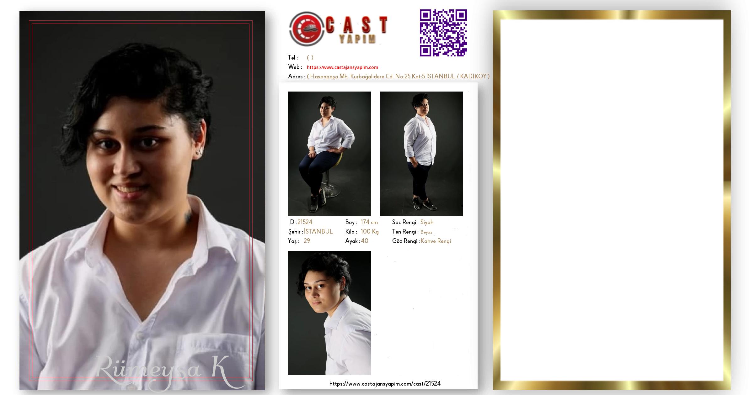 Merhaba, ben Rümeysa. İSTANBUL şehrinde yaşıyorum ve 29 yaşındayım. Genel özelliklerim arasında boyum 174 cm, kilom 100 kg, saç rengim Siyah, göz rengim Kahve Rengi, ten rengim Beyaz.