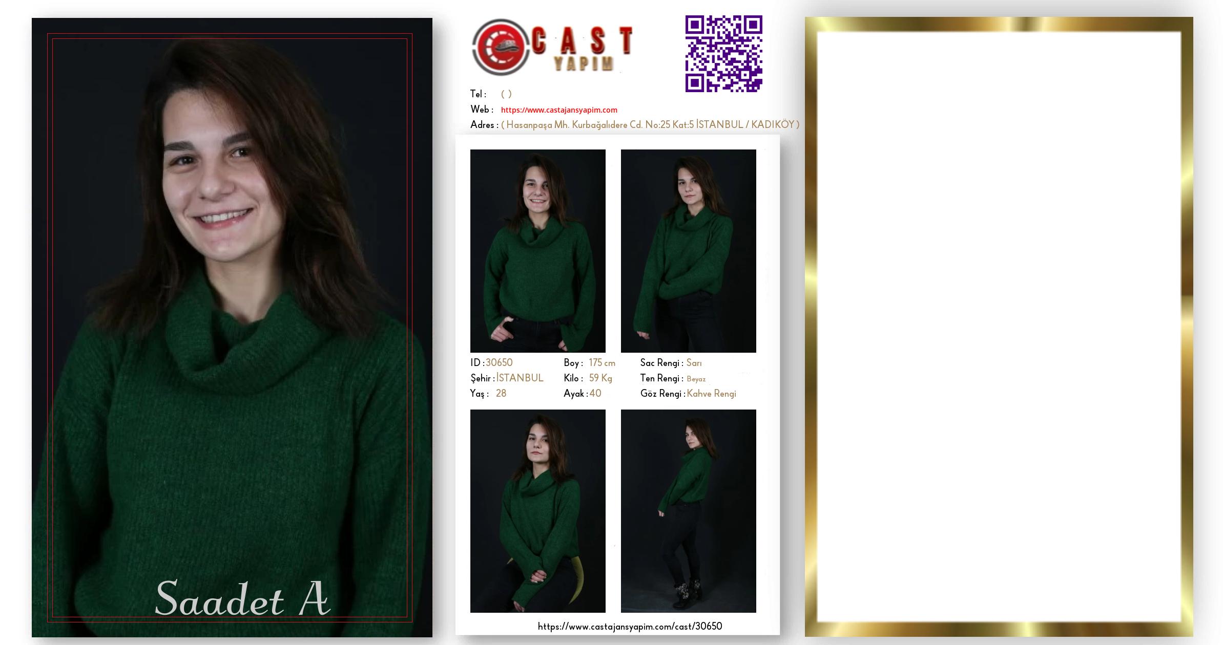Merhaba, ben Saadet. İSTANBUL şehrinde yaşıyorum ve 28 yaşındayım. Genel özelliklerim arasında boyum 175 cm, kilom 59 kg, saç rengim Sarı, göz rengim Kahve Rengi, ten rengim Beyaz.