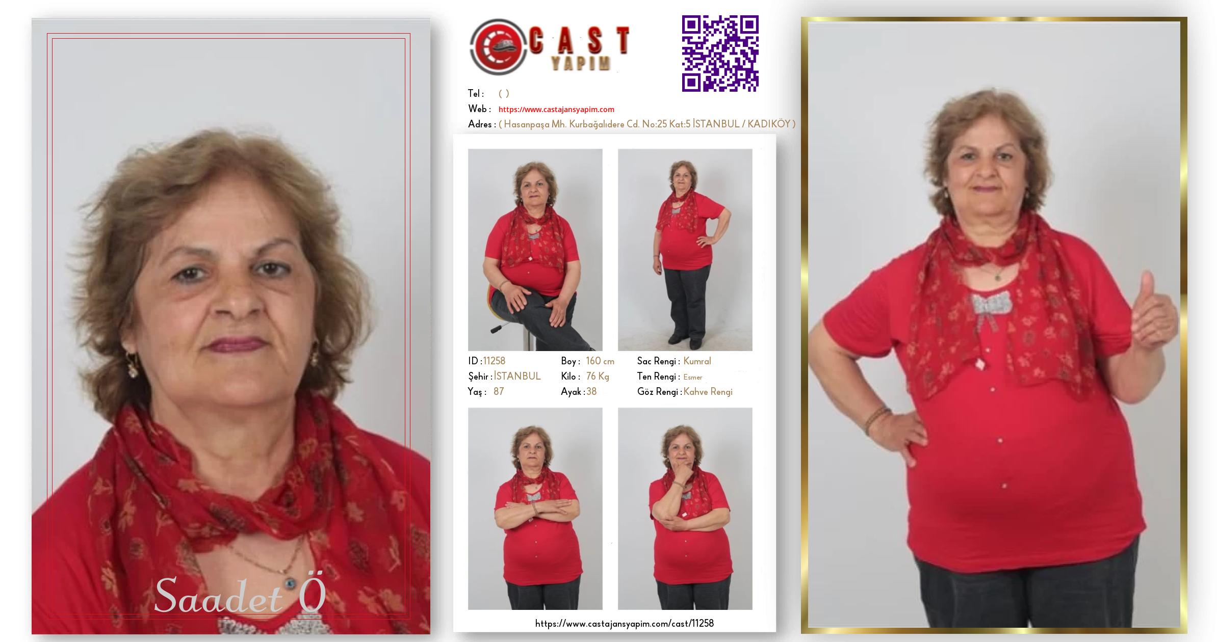 Merhaba, ben Saadet Ö. İSTANBUL şehrinde yaşıyorum ve 87 yaşındayım. Genel özelliklerim arasında boyum 160 cm, kilom 76 kg, saç rengim Kumral, göz rengim Kahve Rengi, ten rengim Esmer.