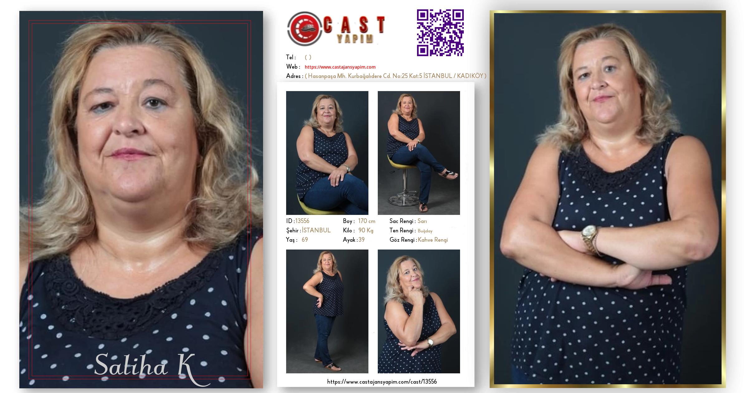 Merhaba, ben Saliha. İSTANBUL şehrinde yaşıyorum ve 69 yaşındayım. Genel özelliklerim arasında boyum 170 cm, kilom 90 kg, saç rengim Sarı, göz rengim Kahve Rengi, ten rengim Buğday.