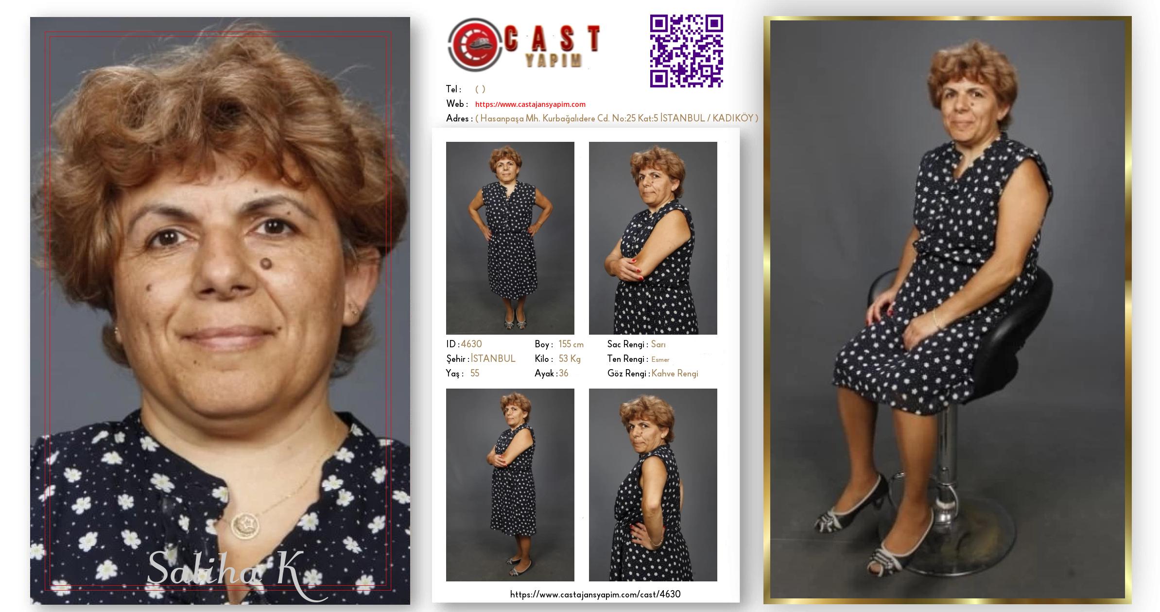 Merhaba, ben Saliha. İSTANBUL şehrinde yaşıyorum ve 55 yaşındayım. Genel özelliklerim arasında boyum 155 cm, kilom 53 kg, saç rengim Sarı, göz rengim Kahve Rengi, ten rengim Esmer.