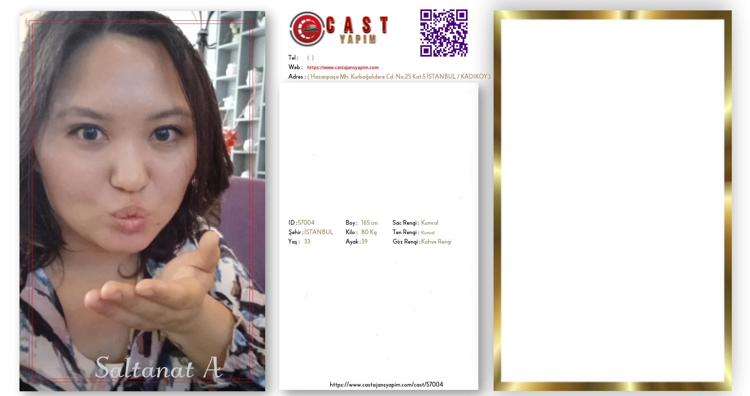 Merhaba, ben Saltanat. İSTANBUL şehrinde yaşıyorum ve 33 yaşındayım. Genel özelliklerim arasında boyum 165 cm, kilom 80 kg, saç rengim Kumral, göz rengim Kahve Rengi, ten rengim Kumral.