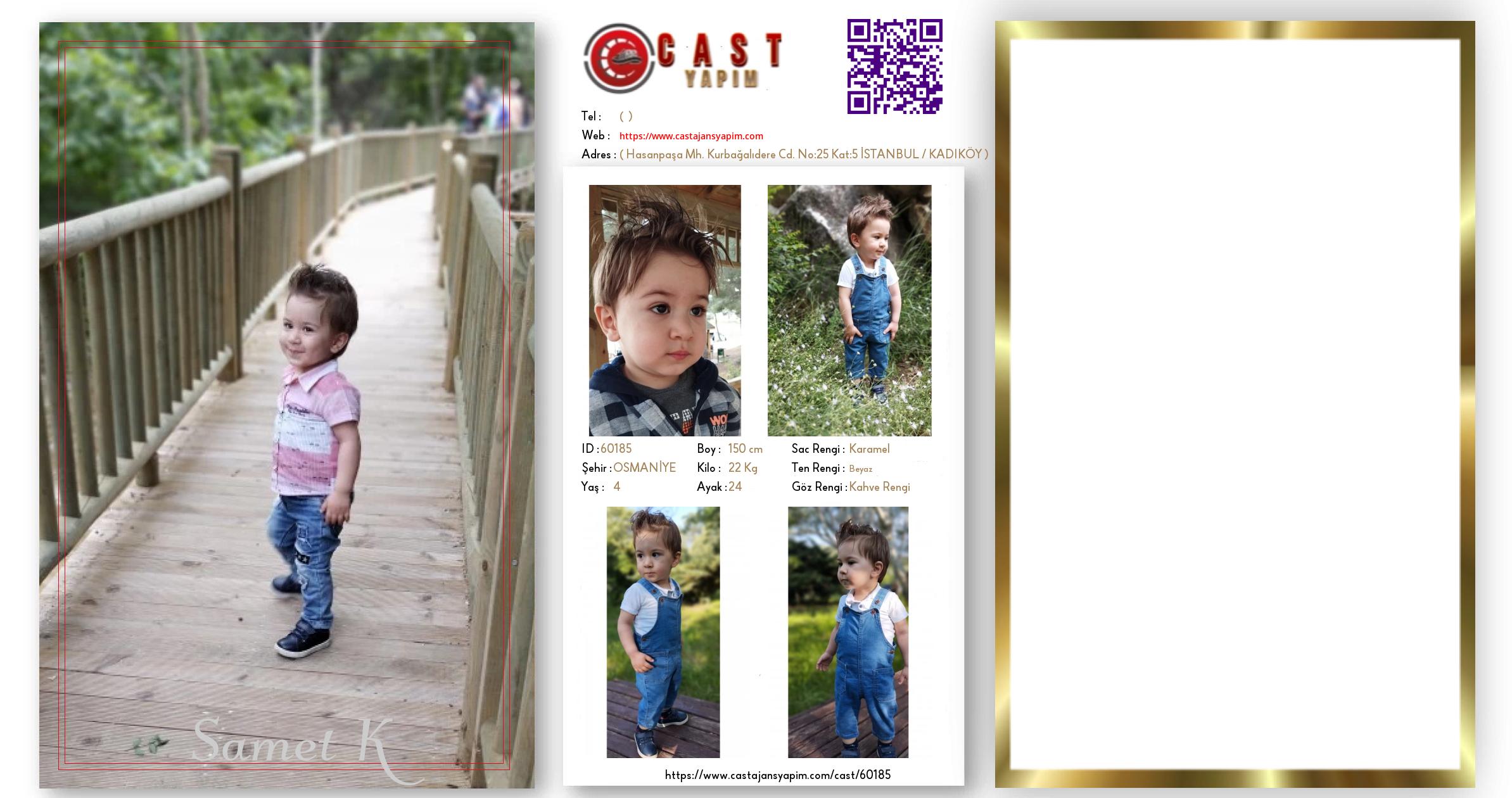 Merhaba, ben Samet K. OSMANİYE şehrinde yaşıyorum ve 4 yaşındayım. Genel özelliklerim arasında boyum 150 cm, kilom 22 kg, saç rengim Karamel, göz rengim Kahve Rengi, ten rengim Beyaz.