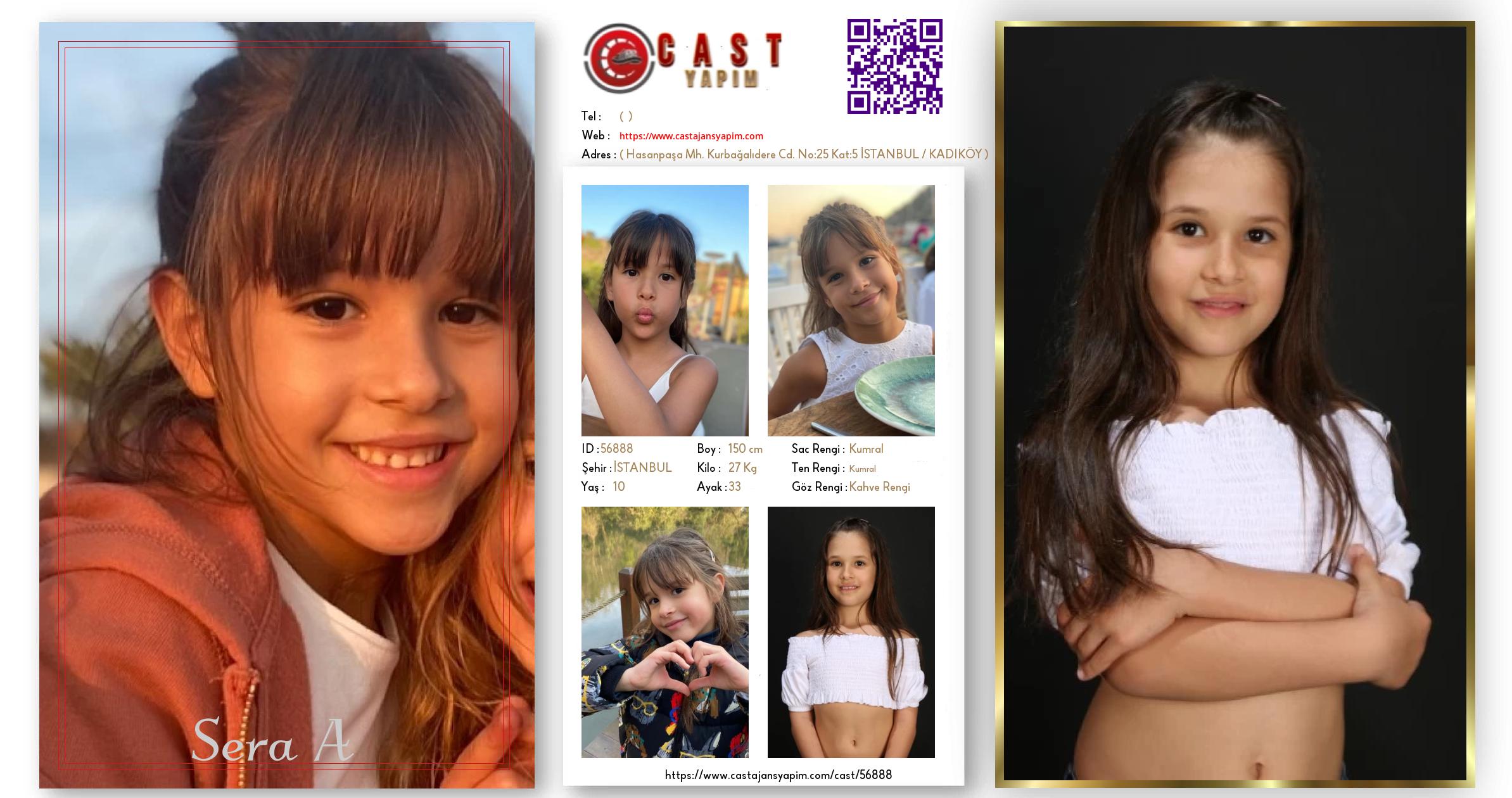 Merhaba, ben Sera A. İSTANBUL şehrinde yaşıyorum ve 10 yaşındayım. Genel özelliklerim arasında boyum 150 cm, kilom 27 kg, saç rengim Kumral, göz rengim Kahve Rengi, ten rengim Kumral.