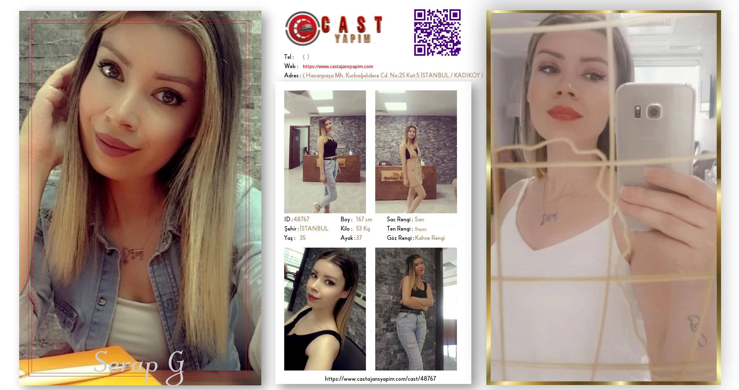 Merhaba, ben Serap. İSTANBUL şehrinde yaşıyorum ve 35 yaşındayım. Genel özelliklerim arasında boyum 167 cm, kilom 53 kg, saç rengim Sarı, göz rengim Kahve Rengi, ten rengim Beyaz.