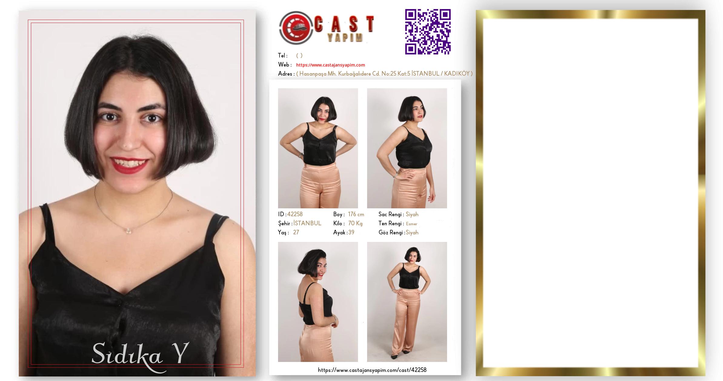 Merhaba, ben Sıdıka. İSTANBUL şehrinde yaşıyorum ve 27 yaşındayım. Genel özelliklerim arasında boyum 176 cm, kilom 70 kg, saç rengim Siyah, göz rengim Siyah, ten rengim Esmer.