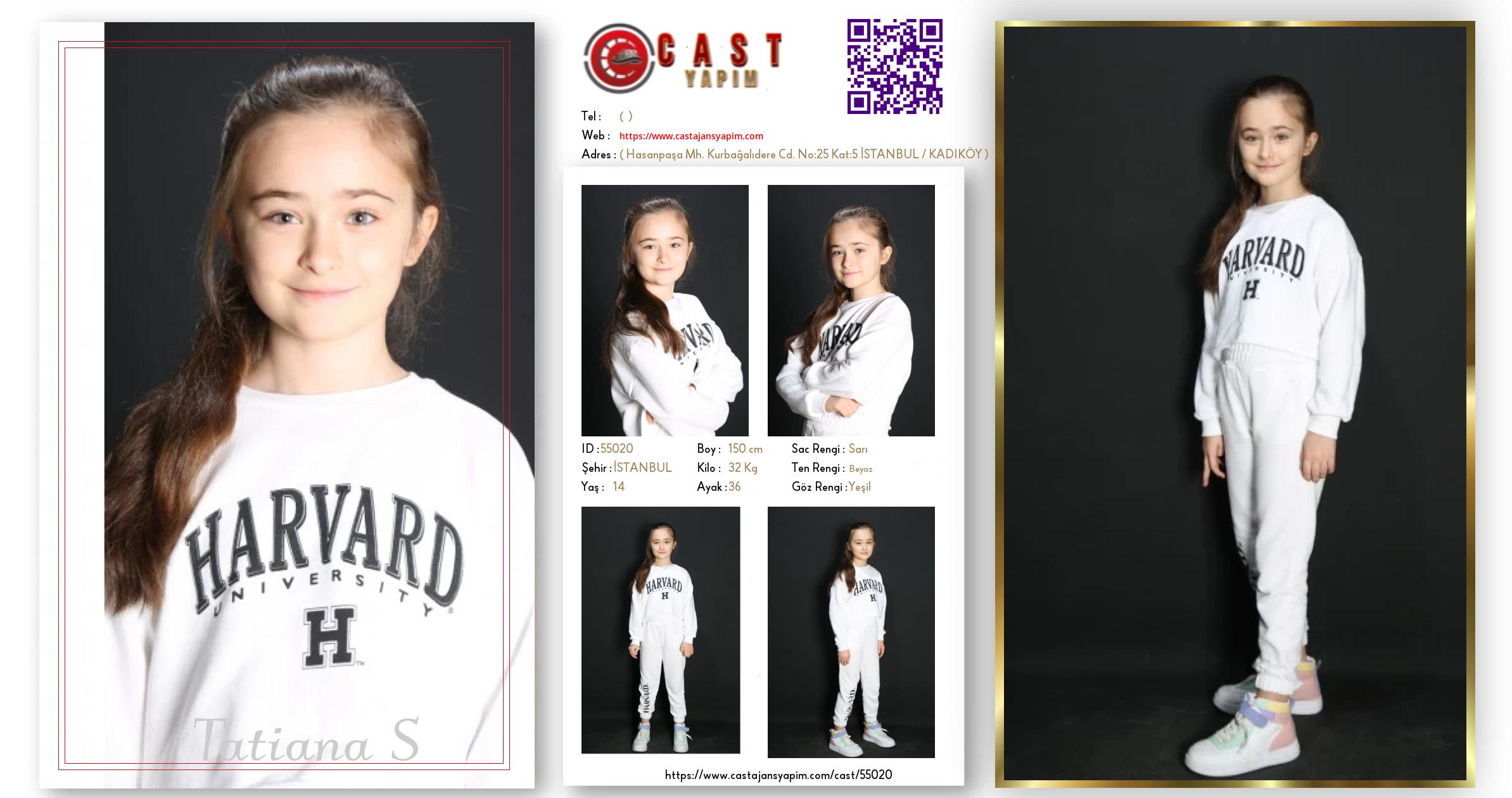 Merhaba, ben Tatiana. İSTANBUL şehrinde yaşıyorum ve 14 yaşındayım. Genel özelliklerim arasında boyum 150 cm, kilom 32 kg, saç rengim Sarı, göz rengim Yeşil, ten rengim Beyaz.