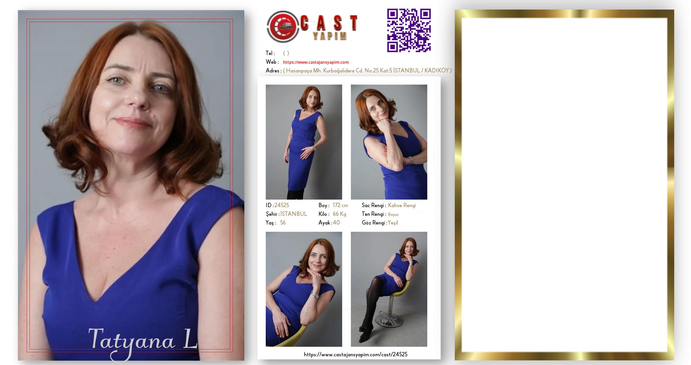 Merhaba, ben Tatyana. İSTANBUL şehrinde yaşıyorum ve 56 yaşındayım. Genel özelliklerim arasında boyum 172 cm, kilom 66 kg, saç rengim Kahve Rengi, göz rengim Yeşil, ten rengim Beyaz.