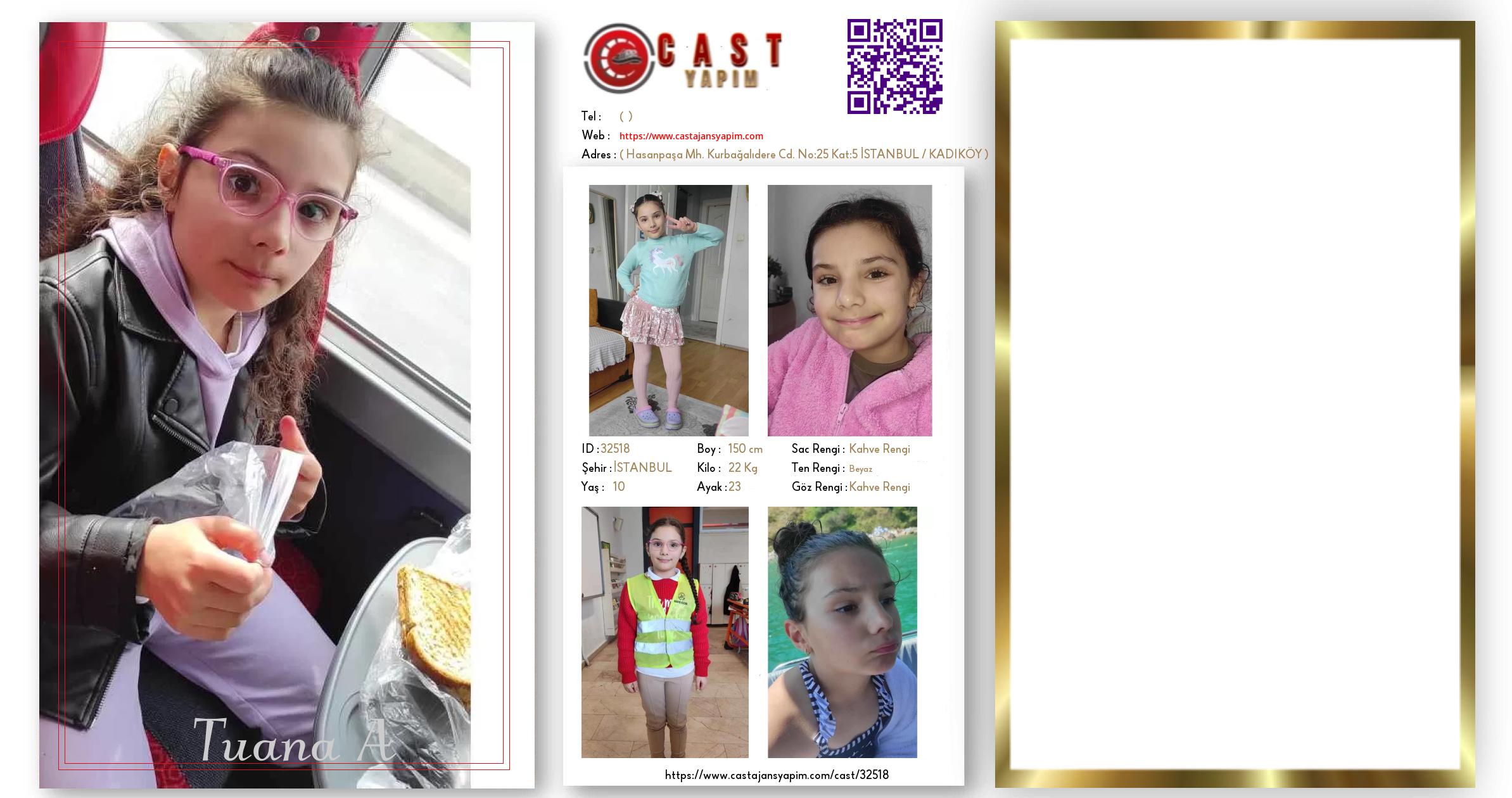 Merhaba, ben Tuana A. İSTANBUL şehrinde yaşıyorum ve 10 yaşındayım. Genel özelliklerim arasında boyum 150 cm, kilom 22 kg, saç rengim Kahve Rengi, göz rengim Kahve Rengi, ten rengim Beyaz.