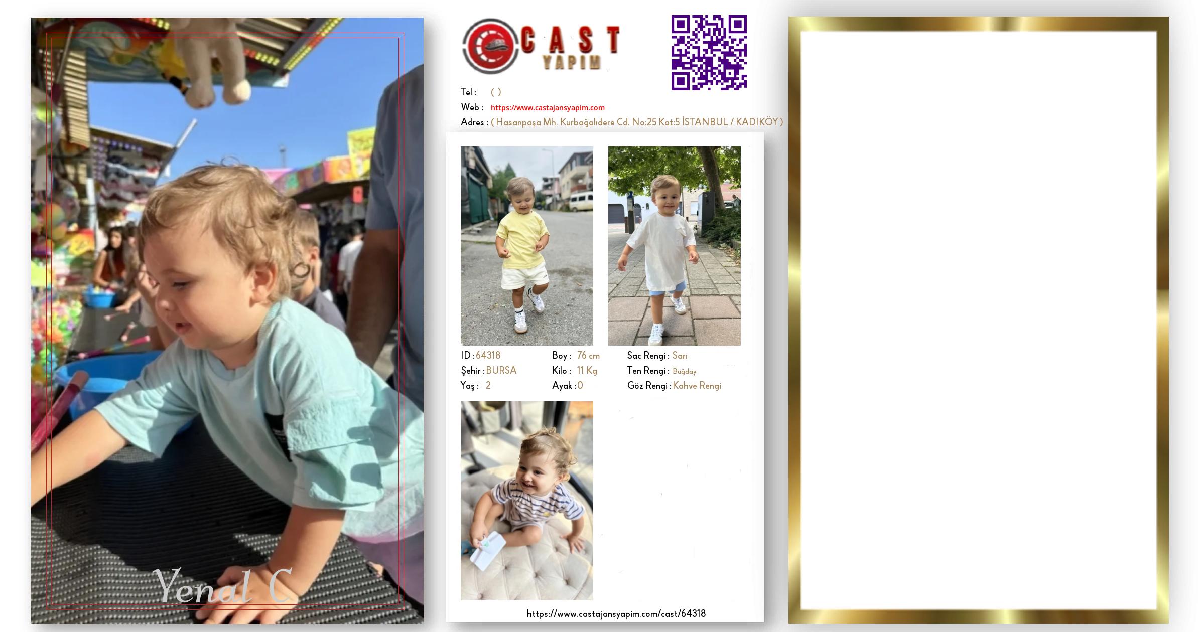 Merhaba, ben Yenal. BURSA şehrinde yaşıyorum ve 2 yaşındayım. Genel özelliklerim arasında boyum 76 cm, kilom 11 kg, saç rengim Sarı, göz rengim Kahve Rengi, ten rengim Buğday.