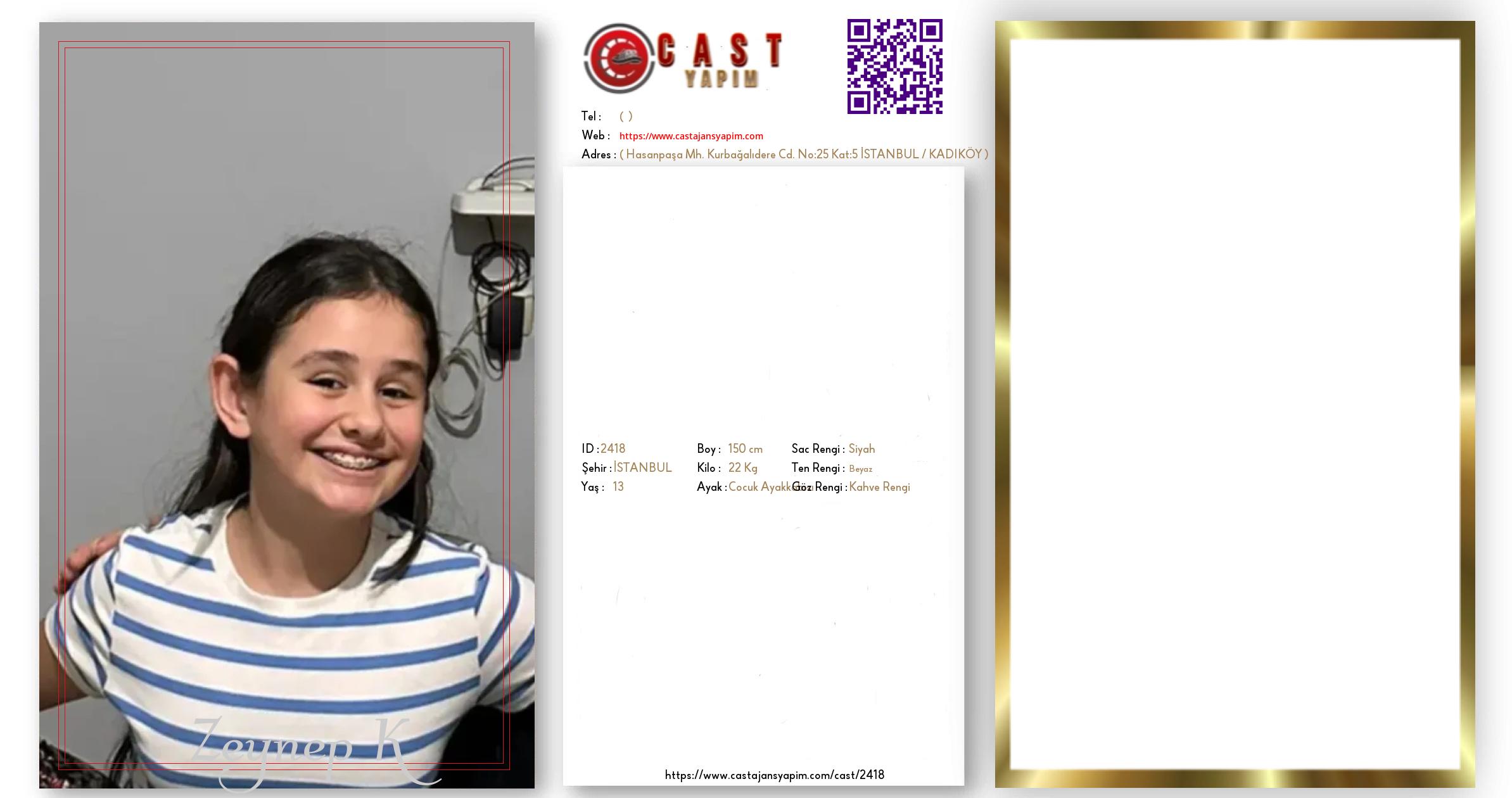 Merhaba, ben Zeynep K. İSTANBUL şehrinde yaşıyorum ve 13 yaşındayım. Genel özelliklerim arasında boyum 150 cm, kilom 22 kg, saç rengim Siyah, göz rengim Kahve Rengi, ten rengim Beyaz.